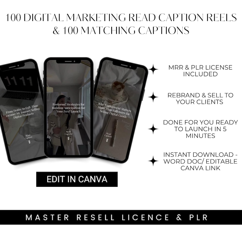 100 Digital Marketing Caption Reels + 100 Matching Captions | MRR & PLR | Editable Canva Templates