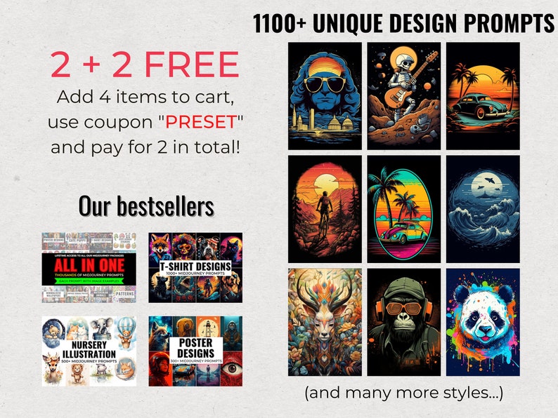 Don’t miss out on this extraordinary opportunity purchase now and embark on an exciting creative expedition with our More Than 1100 T-Shirt Design Midjourney Prompts! Witness your imagination transform into astonishing designs that will captivate and delight your audience. Turn your artistic dreams into reality today!