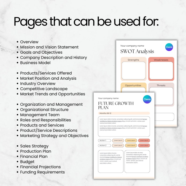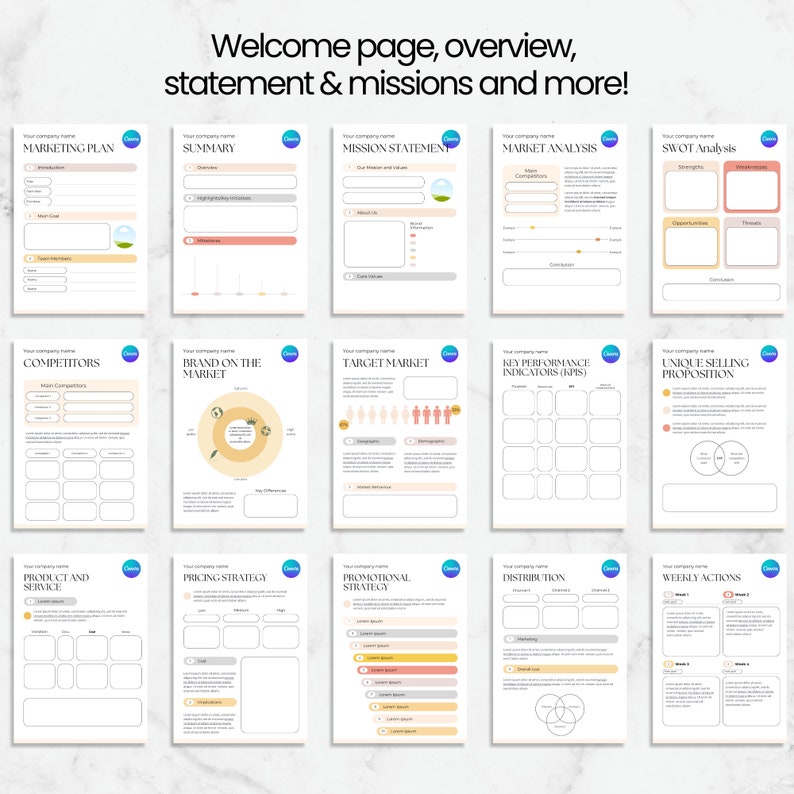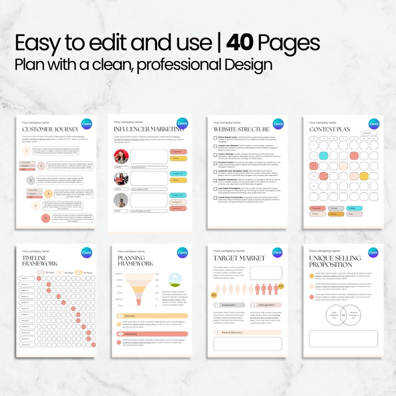 Take care of your marketing plans with our canva template! 50 editable pages for the perfect strategy not only for a new businesses but also for the old market savvy. Take your strategy to the next level with a template containing the most important elements to start or expand your business.