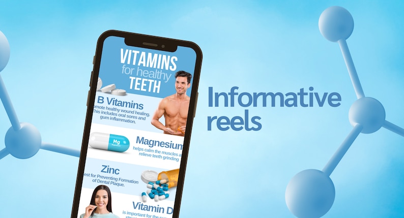 Need help creating social media reels for your dental practice? We’ve got you covered. Weve created 60 reels that are ready for you to use to market your dental office. They’re completely customizable on Canva using the free subscription. You dont need to be a design expert or a Canva pro to use these templates. You need a basic knowledge of Canva – thats it! Drag and drop your logo in, download & you’re ready to post. This is perfect for busy dental offices that want to grow their practice and get new patients.