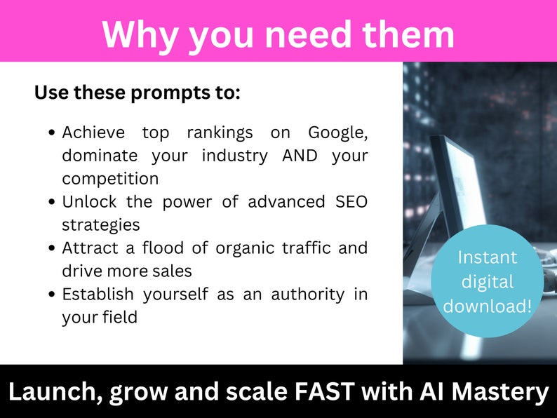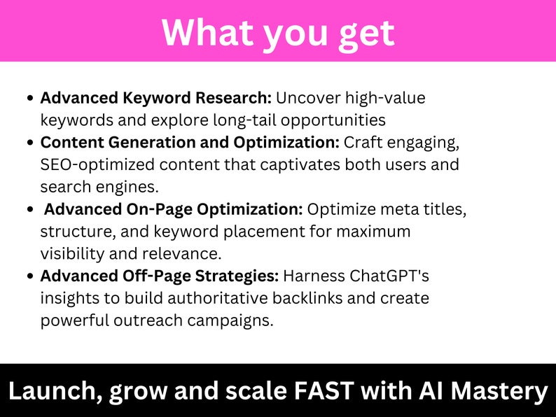 This advanced Chat GPT SEO Prompts pack is perfect for those looking for SEO guidance. Skyrocket your SEO Productivity with over 550 ChatGPT prompts that enable you to: