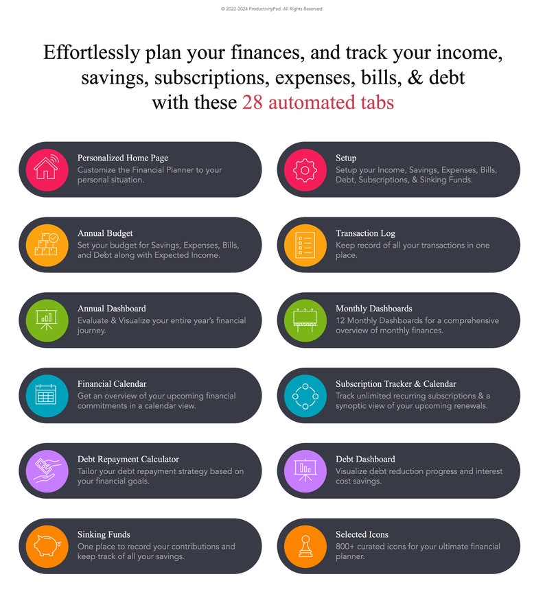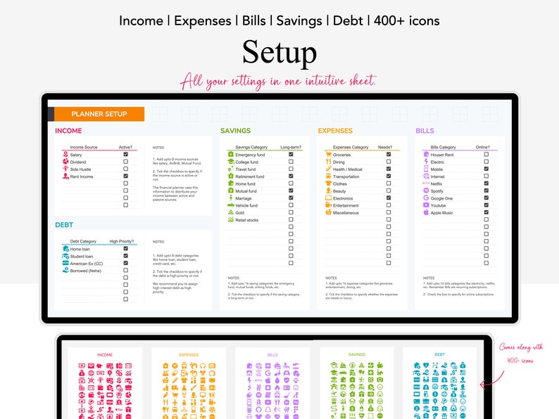 This comprehensive financial tracker comes along with 800+ curated icons.