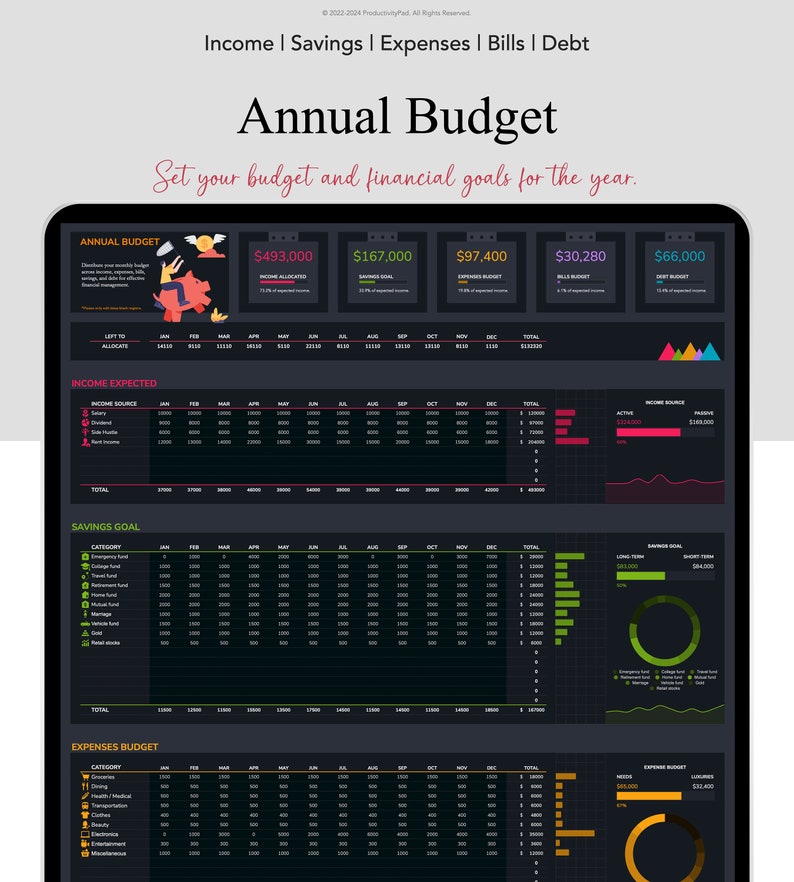 Annual Budget: Craft your annual budget effortlessly. Allocate funds to income, savings, expenses, bills, debt all in one place.