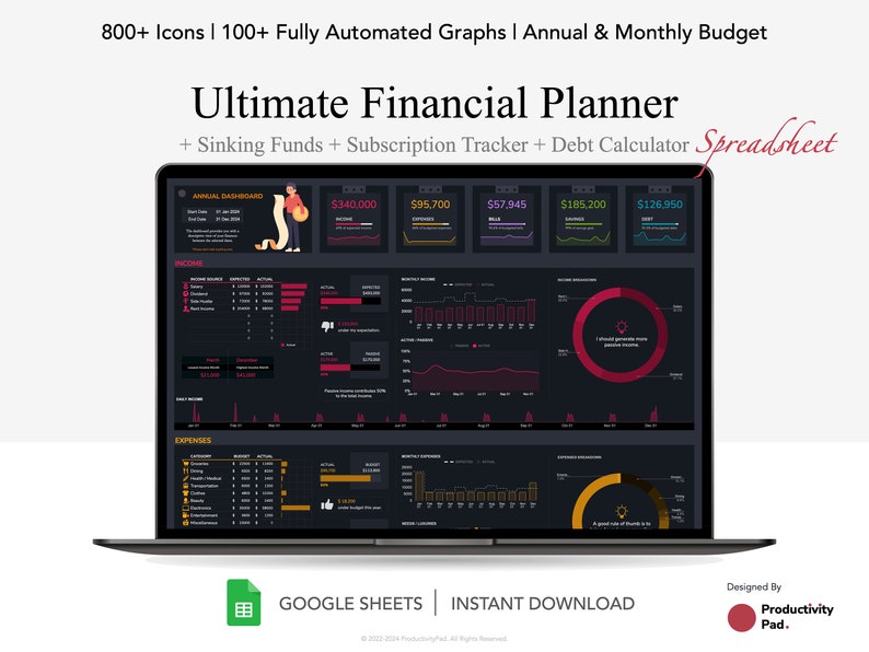 The Annual and Monthly Budget Planner Google Sheet is a comprehensive financial management tool designed to provide you with an organized, clear, and detailed view of your income, savings, expenses, bills and debts. The Financial Planner, featuring Annual and Monthly Budget is bundled with the Debt Repayment Calculator, Sinking Funds, and Subscription Tracker to offer a comprehensive suite for managing your finances effectively.