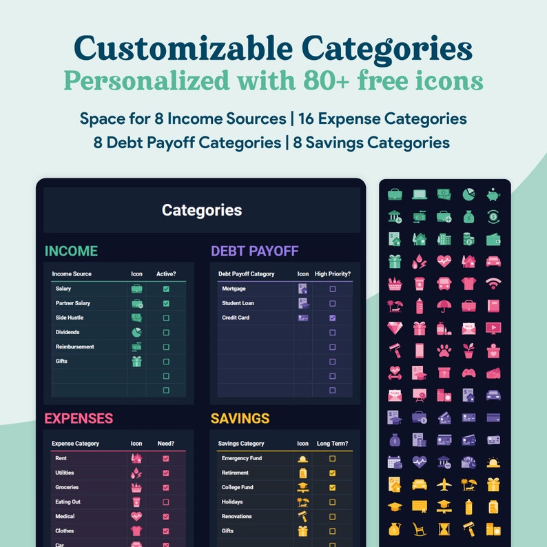 – Customizable Setup Tab Personalize your finances with unique icons from a selection of 80 free icons. There is space for 8 income sources, 24 expense categories, 8 debt payoff categories and 8 savings categories.