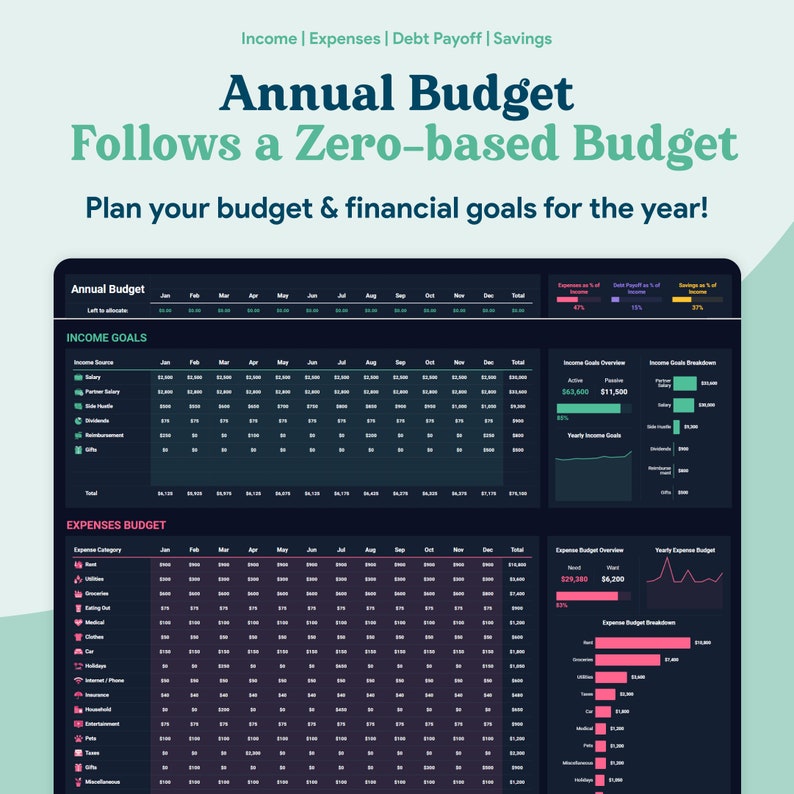 – Annual Budget Plan This zero-based budget tab allows you to plan out your income, expenses, debt payoff and savings for the year.