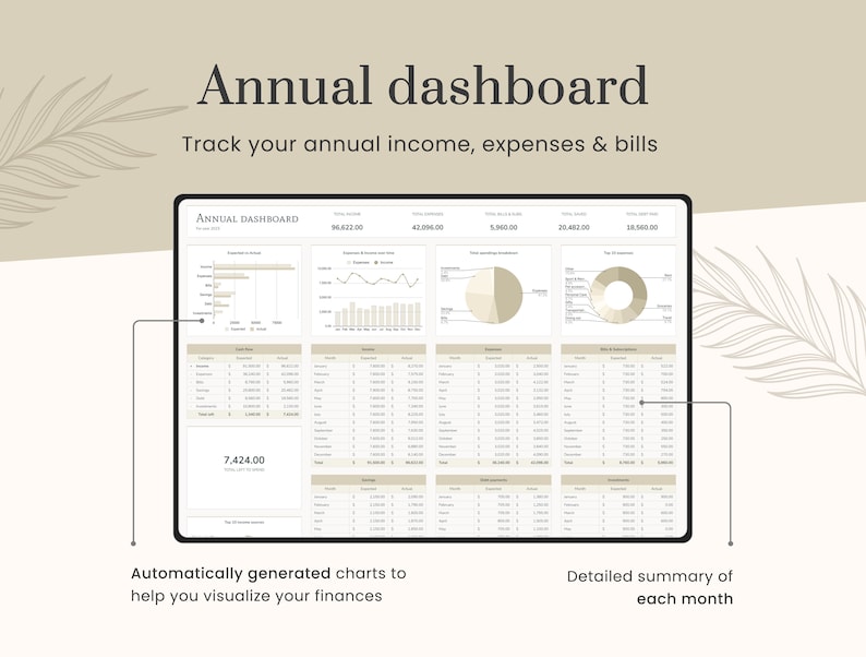 Annual Dashboard: Get a yearly financial summary, including income, expenses, bills & subscriptions, savings and debt payments.