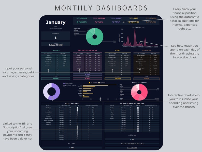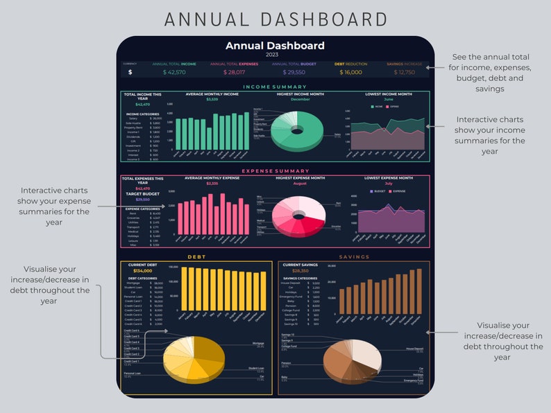 View your financial performance throughout the year. Look at the charts and graphs to see how income, expenses, budget, debt and savings changed throughout the year.