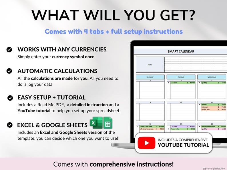 Read the instruction or watch the YouTube tutorial to easily understand how to maximize the use of your spreadsheet