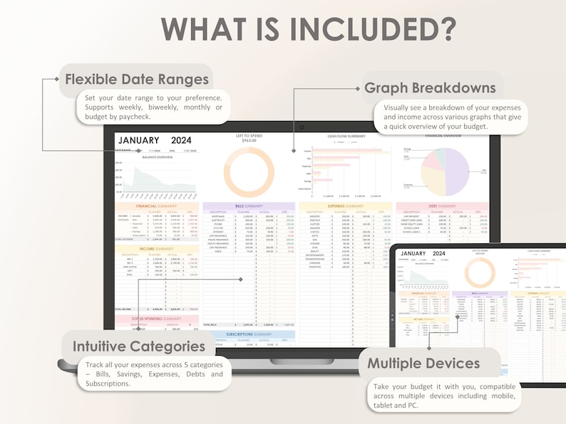 Our package supports a flexible date range – budget by paycheck, weekly, biweekly, monthly or your own personal preference.