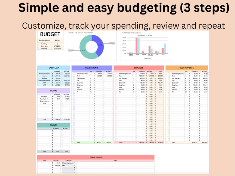 Start budgeting with our easiest budget planner for Google Sheets yet! This 1 tab budget is the ultimate beginner budget and for those who want to start taking control of their finances. Start budgeting with 3 easy steps, budgeting has never been so easy! No matter if you want to budget by paycheck, budget monthly, budget weekly or even budget biweekly with this spreadsheet you can do it all.