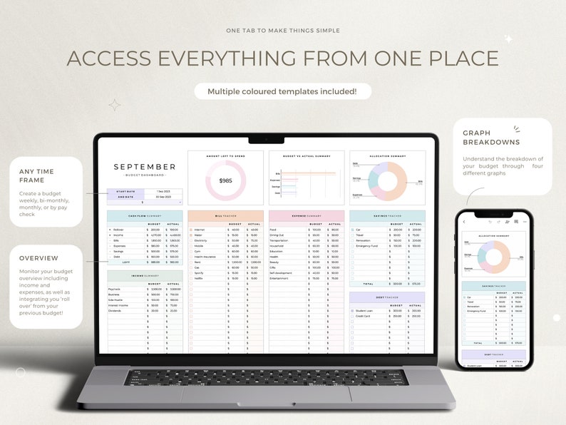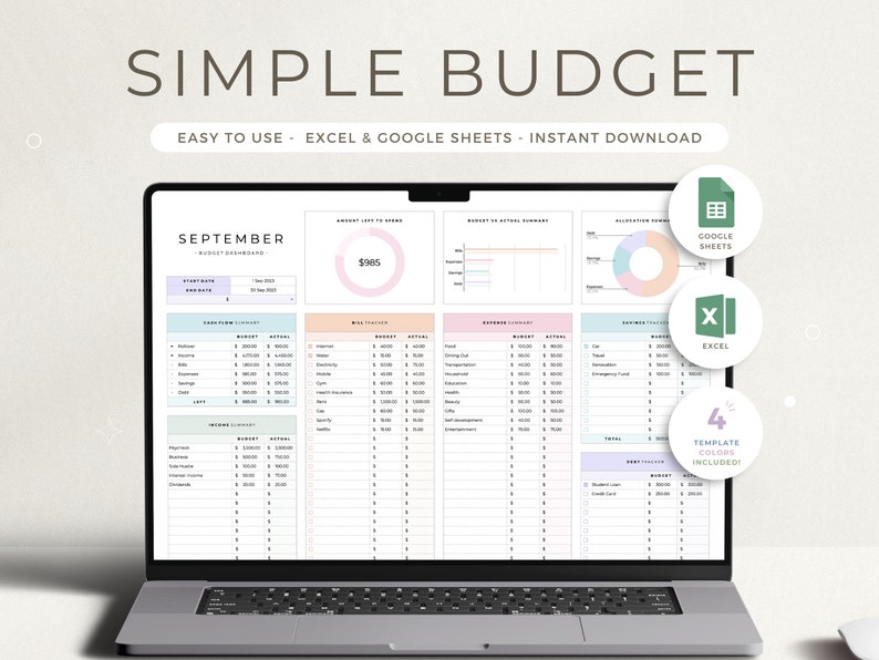 Start your budgeting journey with our budget planner for Excel and Google Sheets! Our budget tracker is simple and easy to set up and use through automatic calculations to monitor income, expenses, savings and debt. This one tab spreadsheet will help to budget weekly, budget biweekly, budget monthly, or budget by paycheck.