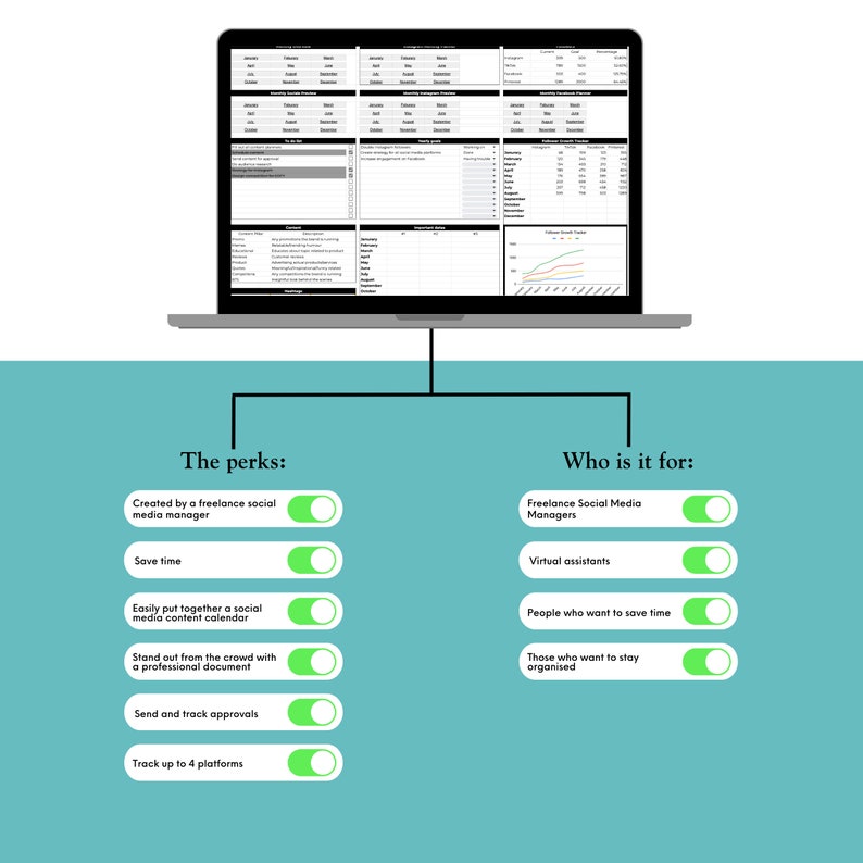 Designed to work in Google Sheets, this Complete Social Media Content Planner is all you need to track and organise your digital presence. Social media managers and freelancers will love how easy yet comprehensive it is, with features to track approvals and send them directly to clients or managers. It is also perfect for small business owners who are handling their own social media but just need some help organsing everything and planning ahead.