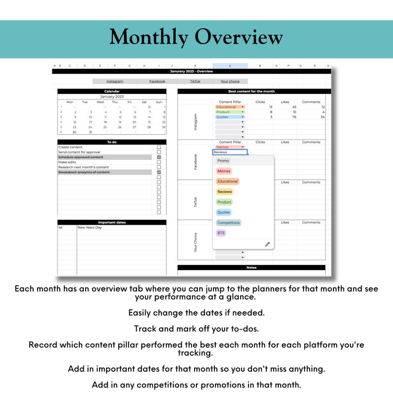There are sections to record which content pillars perform best for each social media account so you can recreate the perfect content formula.