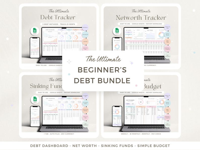 Take control of your debts with our Debt Bundle for Beginners for Google Sheets! It includes our Debt Payoff Tracker Dashboard Sinking Fund Spreadsheet, Net Worth Tracker, and Simple Budget Spreadsheet! Decide on how you want to payoff your debts choosing from the snowball, avalanche, or custom methods. Whether you want to repay your credit card, mortgage, or student loans, our simple to use spreadsheet will illustrate how long it will take you to become debt free. The spreadsheet atomically calculates and populates charts and graphs to make things as easy as possible for you!