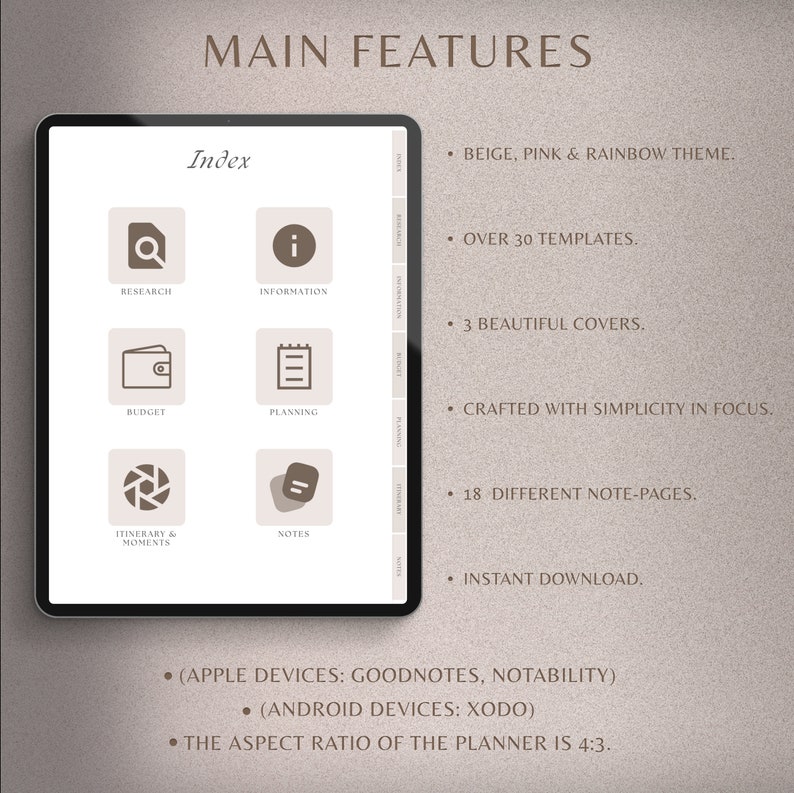 Compatible with: (Apple devices: GoodNotes, Notability, CollaNote) (Android & Windows devices: XODO, Samsung Notes)Please note that the planner has a 4:3 aspect ratio, like all iPads. If your tablet has a different aspect ratio, the planner may have different proportions and may not fill the entire screen.