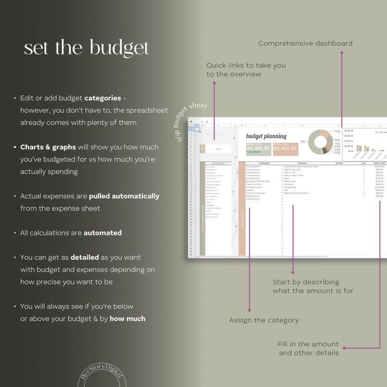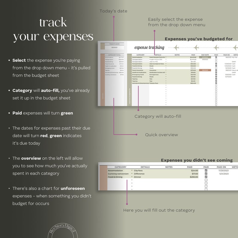 Set Up Sheet, Travel Budget Planner, Travel Expense Tracker, Trip Itinerary, 2 Packing lists, Travel Checklists, Important Travel Info, Travel Bucket List