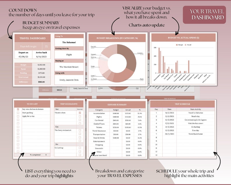 Break down and keep track of every detail of your vacation and your entire travel schedule, as well as your trip costs with the the Travel Dashboard – which comes with automated charts and calculations. Personalize and edit the template for your own trip, expense categories and payment methods too.