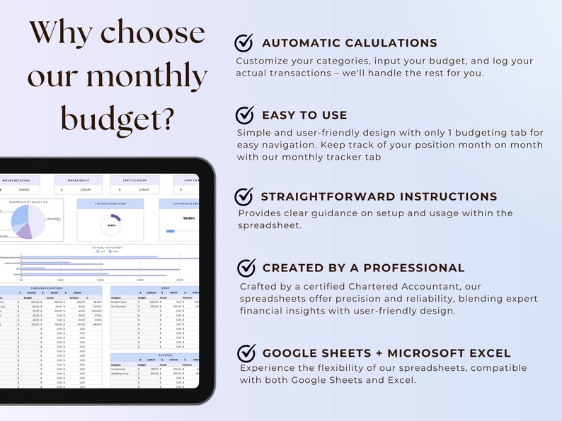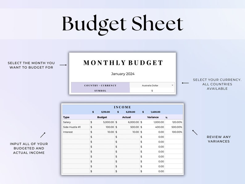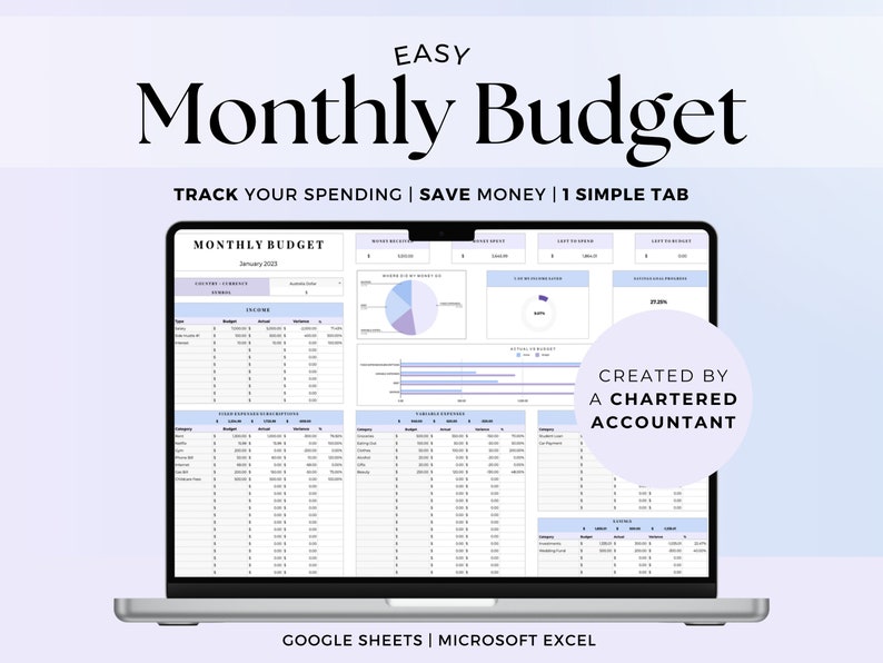 Introducing our Simple Monthly Budget Spreadsheet, the ultimate tool for effective financial management. This single-tab spreadsheet simplifies budgeting by helping you track income, expenses, and savings goals in one organized place. With a user-friendly interface and visual aids, managing finances is intuitive for students, professionals, and anyone aiming to take control of their money. Take charge of your financial future – download our Monthly Budget Spreadsheet now.