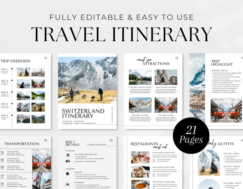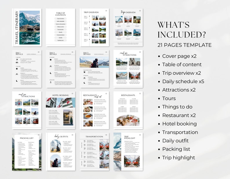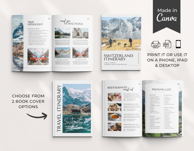 The template is fully editable in Canva for free and you can add hyperlinks to your online resources (locations, boarding passes, etc.) Once finish editing, download the template as a PDF so you can access it on your phone or get it printed into a paper copy itinerary.