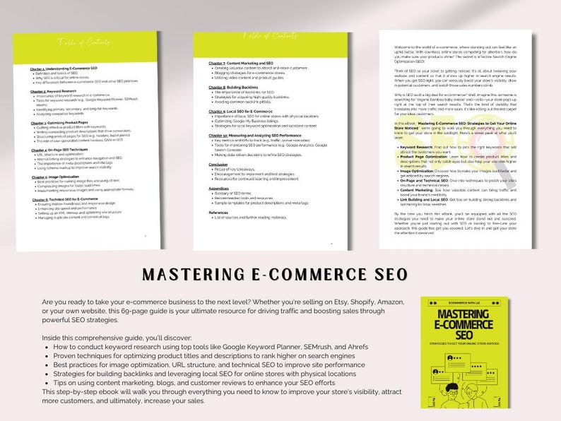 E-commerce SEO guide for boosting traffic and salesthis comprehensive 69-page ebook is the perfect resource for online business owners looking to optimize their stores visibility and drive more customers. Whether you’re selling , Shopify, Amazon, or your own website, Mastering E-Commerce SEO will guide you through the process of increasing your search engine rankings and maximizing your store’s potential.