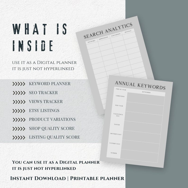 Packed with templates to track keyword performance, search impressions, and seasonal keywords, this planner ensures that youre targeting the right audience at the right time. With both printable and digital options, you can use this planner however it best fits your workfloweither on your computer or printed out for easy reference.