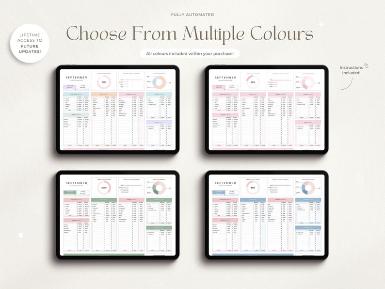 One spreadsheet in four different colours for both Excel and Google Sheets