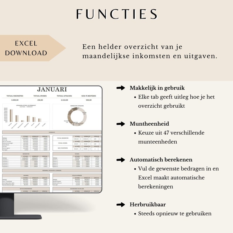 Do you only see English budget sheets ? Then this Dutch Excel monthly budget planner is the perfect solution for you! This user-friendly budget spreadsheet Excel helps you keep track of your income, expenses and savings, with automatic calculations and clear graphs. Ideal for anyone who wants to get more control over his or her finances.