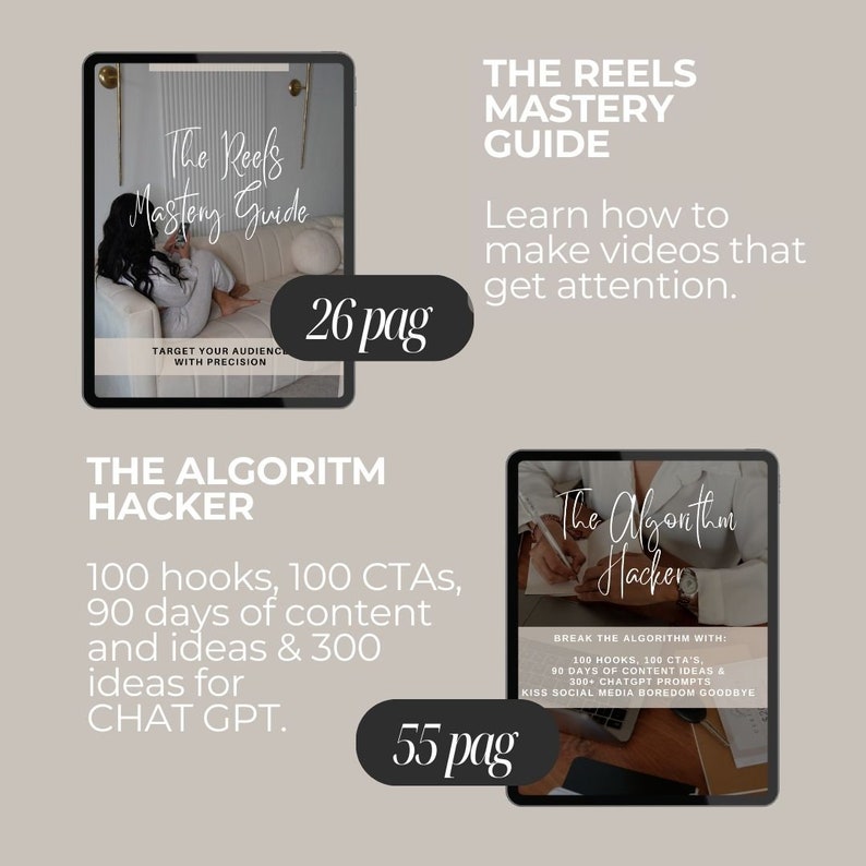 – Guide to Hack Instagram which includes: 100 hooks to attract attention, 90 Days of Content + 300 ChatGPT ideas.