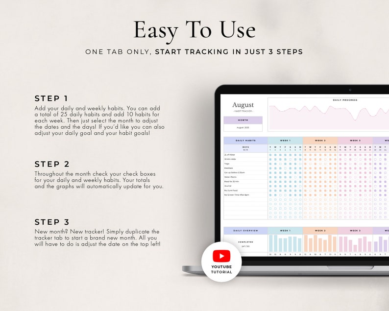 This is a beautiful habit tracker! It is clean, simple, has lovely colours, and is easy and pleasant to use. It was easy to download, and the instruction video was helpful as well. I wanted something on Google Sheets that I could use to track some daily habits I’m trying to implement, and this is just what I was looking for.
