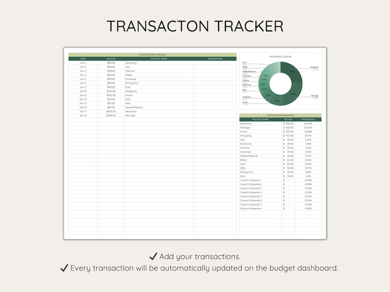 : Seamlessly record income and expenses with a transaction tracker. Automate synchronization of transactions with the monthly dashboards, facilitating comprehensive analysis.