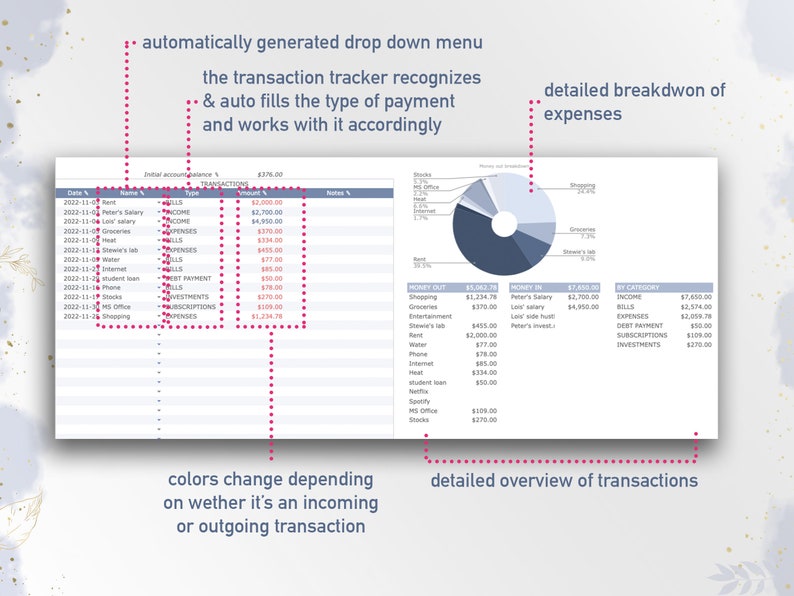 Transaction tracker tab – log in all your transactions (or a SUM of thereof – but no worries, the template will sum on its own if you add them individually). The spreadsheet automatically recognizes the type of transaction and assigns the right category to it & calculates with it accordingly.