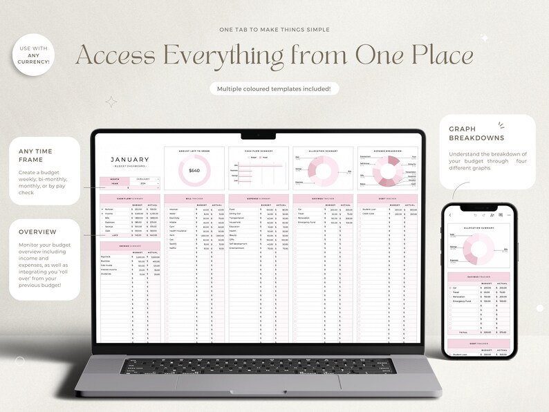 Start your budgeting journey with our monthly budget planner for Google Sheets! Our budget tracker is simple and easy to set up and use through automatic calculations to monitor income, expenses, savings and debt. This five tab spreadsheet will help to budget by month or paycheck and keep track of your bills and subscriptions.