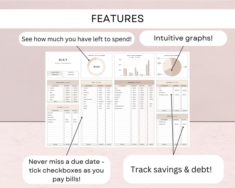 oIncludes trackers comparing actual to budget for income, expenses, bills, savings and debt