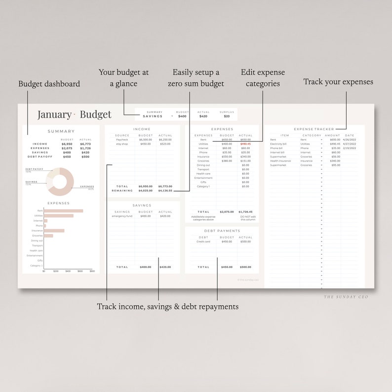 Setup your budget, track your expenses and monitor your finances using this monthly dashboard.