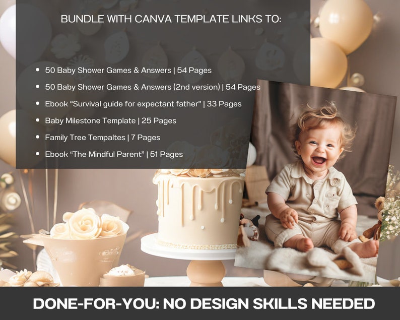 Ebooks about parenting and Ebook about becomming a Father, Milestone Cards Template in Canva, Templates for Baby Shower Games with Answers, Courses, Information of any kind.