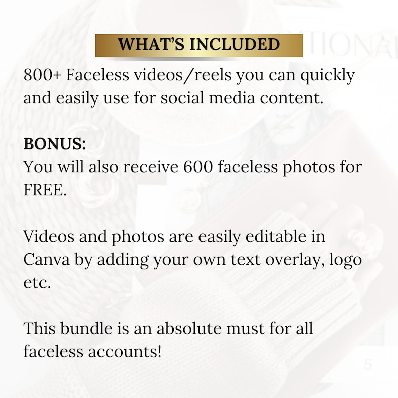 Elevate your online and social media presence to another level with our Done for you 800+ Faceless Video Reels Bundle! Curated for digital marketers, these aesthetically designed videos and images that elude sophistication and style will boost and command attention to enhance your overall content strategy and brand. Perfect for businesses, Influencers, Instagram, TikTok, Pinterest and websites – the list is endless.
