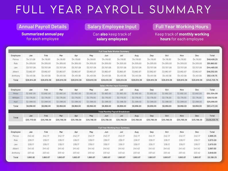 -Full year Summary: A dedicated tab that provides a concise summary of all workers and month over month comparison regarding working hours and pay amount.