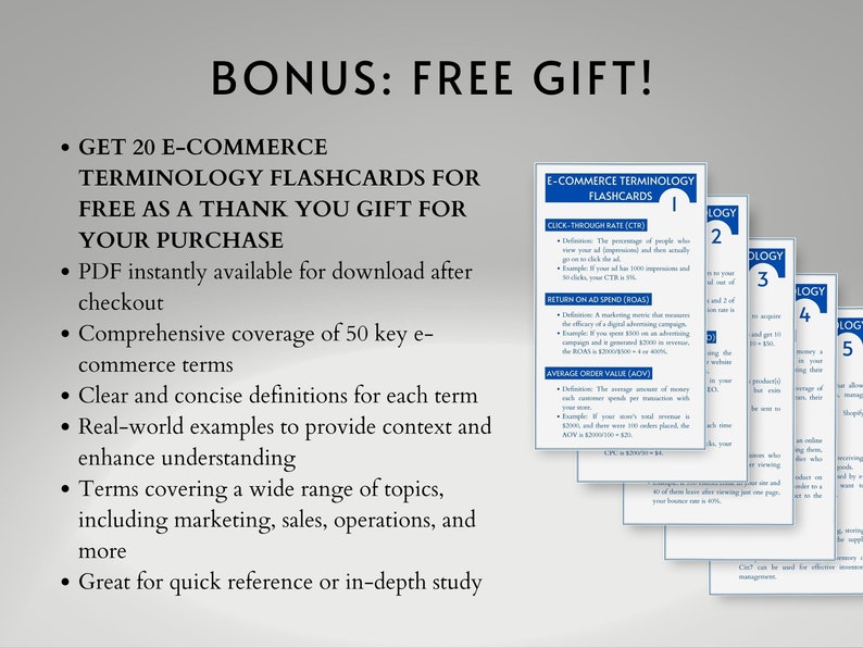 Free Gift With Your Purchase: To thank you for your support, we’re including our Essential E-commerce Flashcards set absolutely free with your purchase! These flashcards will help you quickly learn and understand 50 key e-commerce terms. It’s our way of saying thanks and helping you succeed in your business journey.