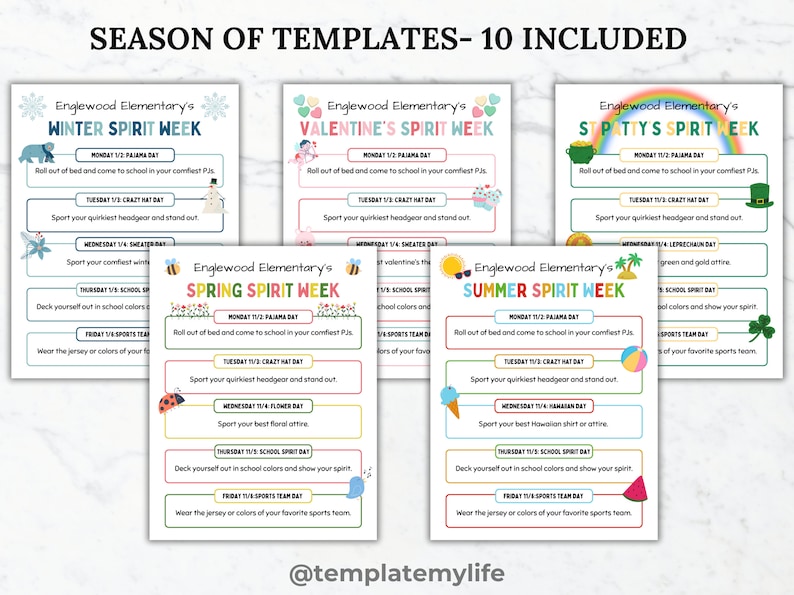 Energize your school’s spirit with our comprehensive school SPIRIT WEEK Flyer Editable Template Bundle, featuring an array of ten expertly crafted templates that capture the essence of monthly school spirit schedules and seasonal events. This versatile bundle ensures you have all the essential templates you need to keep your school community engaged and excited throughout the year, making it an invaluable resource for PTOs, PTAs, and event organizers looking to create captivating handouts that foster a strong sense of school pride and enthusiasm among students, parents, and faculty.