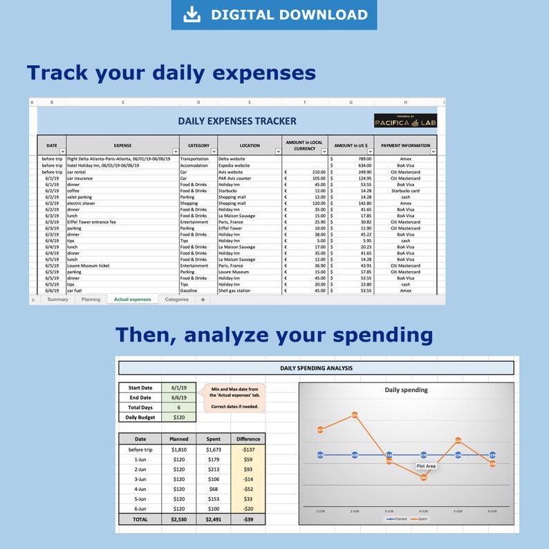 The spreadsheet will let you plan, budget, record, track, and analyze your spending. It includes formulas that will automatically total your expenses, allowing you to track whether you are over or under your budget. There are also graphs and diagrams to visualize where you stand and where your money is going.