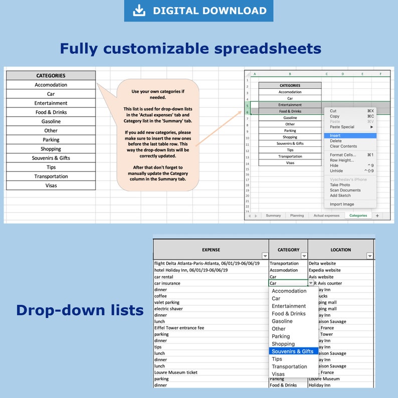 Our Travel Budget template is designed to be user-friendly and easy to use, even for those who are not Excel-savvy. It is fully customizable, so you can play with it and modify it to your taste and needs. It is pre-filled with example data to demonstrate how everything works. Feel free to replace the examples with your own data.
