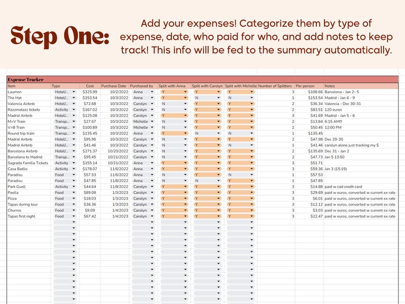 Expense tracker and cost splitter spreadsheet for Google Sheets helps manage expenses and split costs between multiple people. Great for Travelling, Roommate Expenses, Friends, and Eating out. Online spreadsheet can be accessed anywhere via your google account and can be shared with others. Template comes with easy to follow instructions.