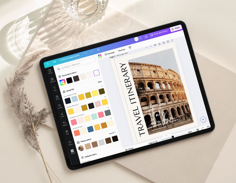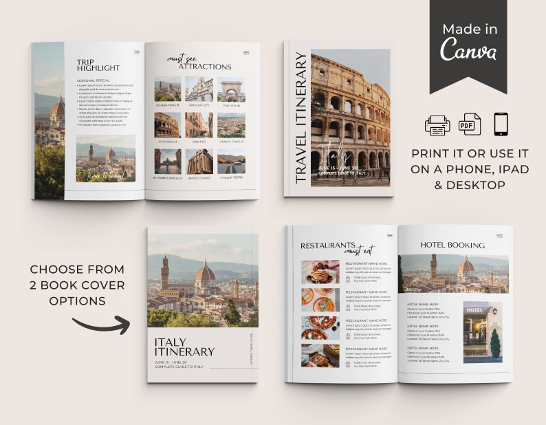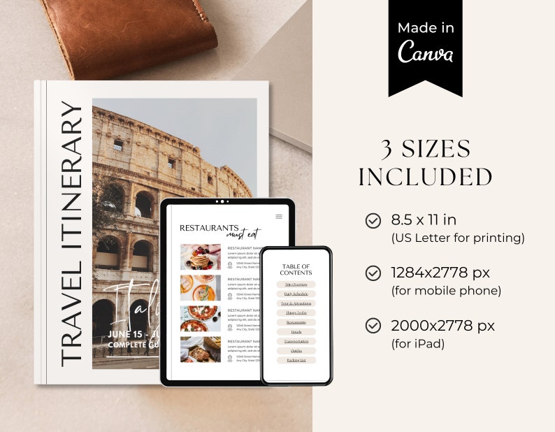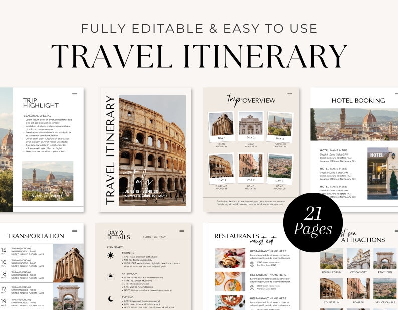 The template is fully editable in Canva for free and you can add hyperlinks to your online resources (locations, boarding passes, etc.) Once finish editing, download the template as a PDF so you can access it on your phone or get it printed into a paper copy itinerary.