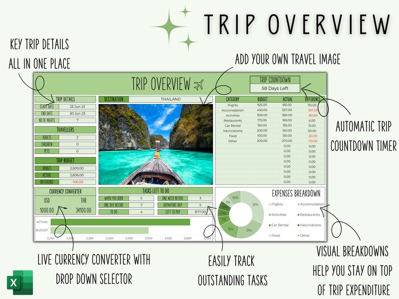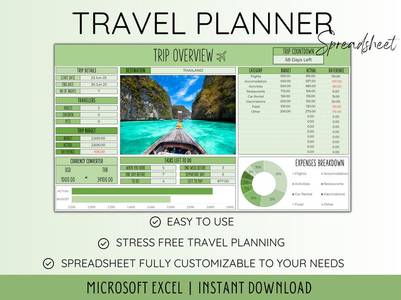 Our travel planner lets you customize a holiday itinerary that covers everything from flights and hotels to dining options and local attractions. You can also budget your trip and track expenses, ensuring that you stay within your financial means. The planner includes a checklist of things to do before flying, such as checking in for your flight and renewing your passport and also includes a packing list which you can tailor to your specific needs ensuring you never forget anything.