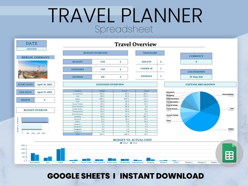 The ultimate tool for organizing your travel plans, tracking expenses, and creating an itinerary for your next vacation. This Google Sheets Template is customizable and easy to use, making it the perfect tool for individuals, families, and travel groups.
