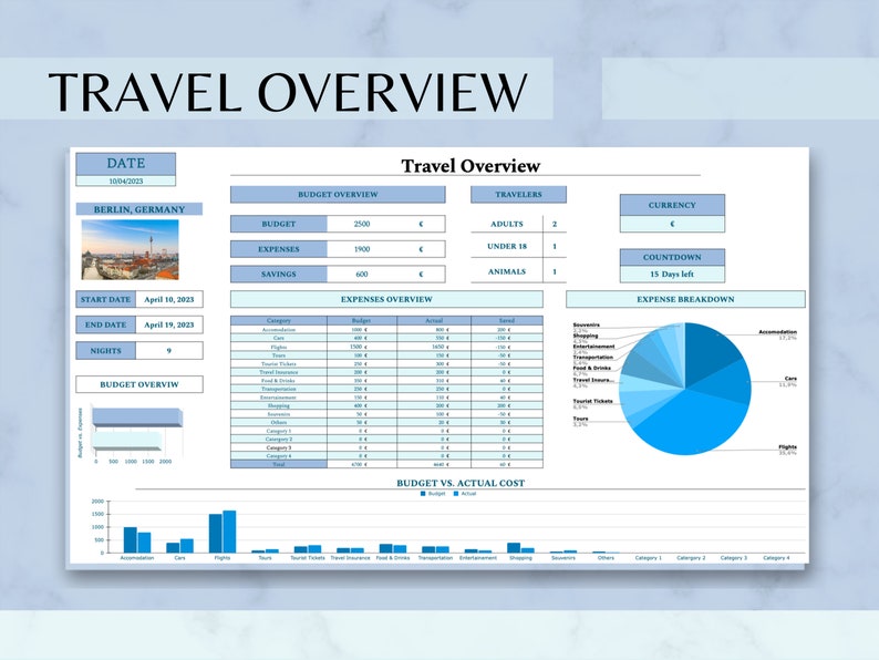 Our Travel Budget Planner helps you keep track of your expenses, allowing you to stay within your budget and avoid overspending. The expenses tracker lets you input all of your vacation costs, from flights and accommodations to food and activities, so you can easily see where your money is going.