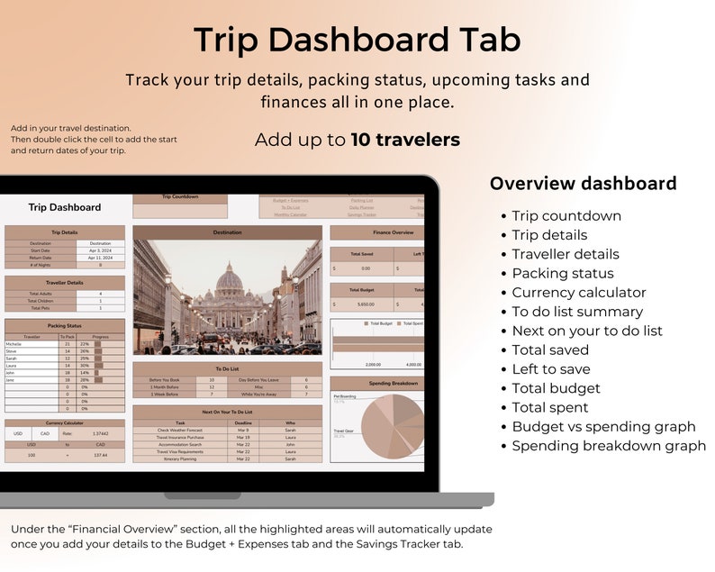 Overview dashboard: Provides trip details, packing status, to-do list summary, and financial overview.