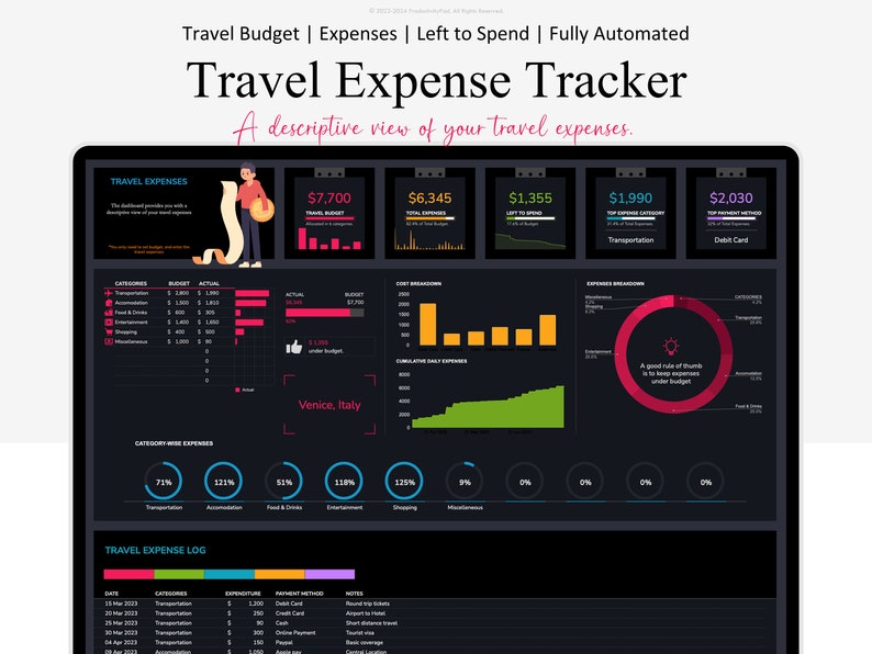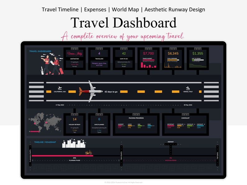 Travel Planner Spreadsheet | Daily Itinerary | Travel Packing List | Travel Expense Tracker | Dark Mode