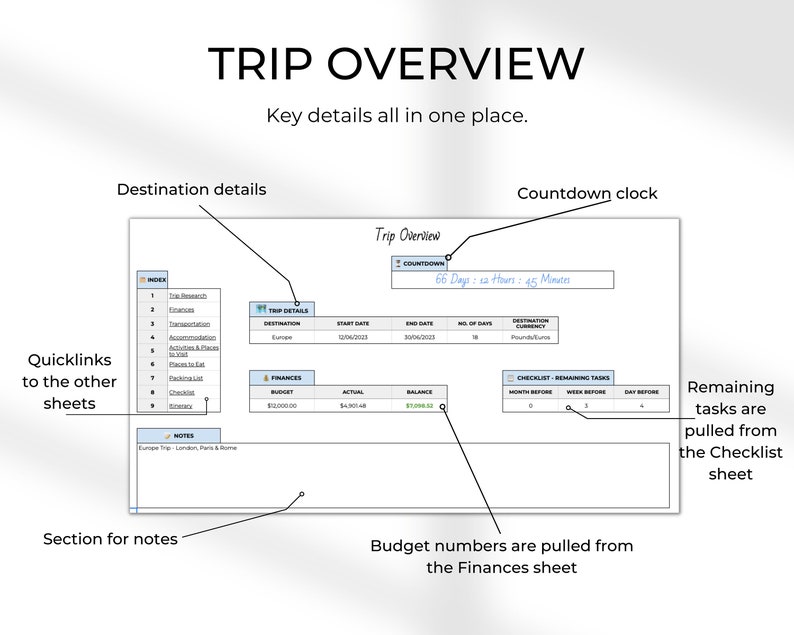 Trip Overview – Snapshot of your trip details on one page. Includes a countdown timer and quick links to the other sheets. Some information from this sheet is automatically pulled from other sheets.